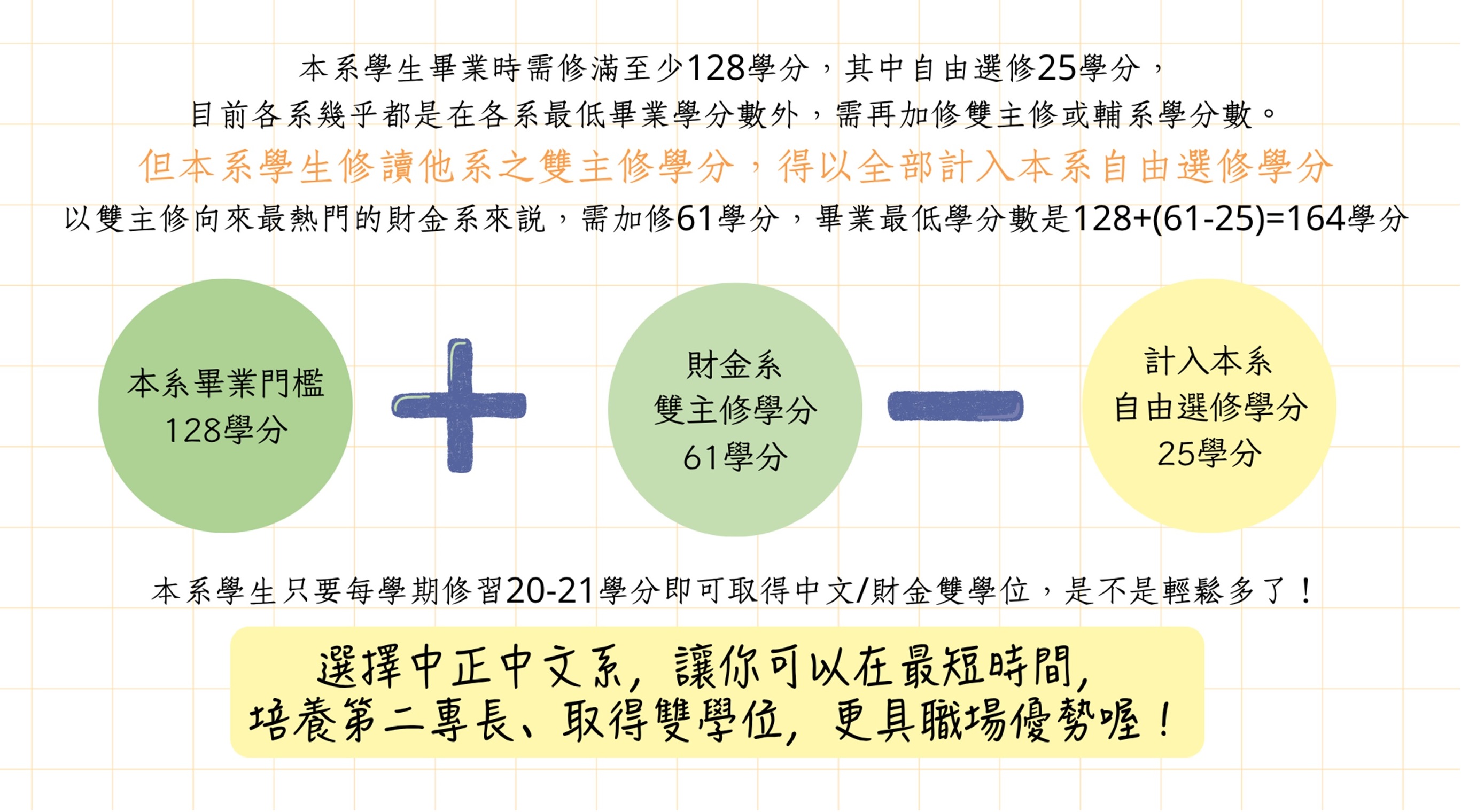 但因本系雙主修學分可以計入自由選修學分,所以畢業最低學分數是128+(61-25)=164學分,164學分/8學期=20.5學分,本系學生只要每學期修習20-21學分即可取得中文/財金雙學位,而且是不是輕鬆多了!?