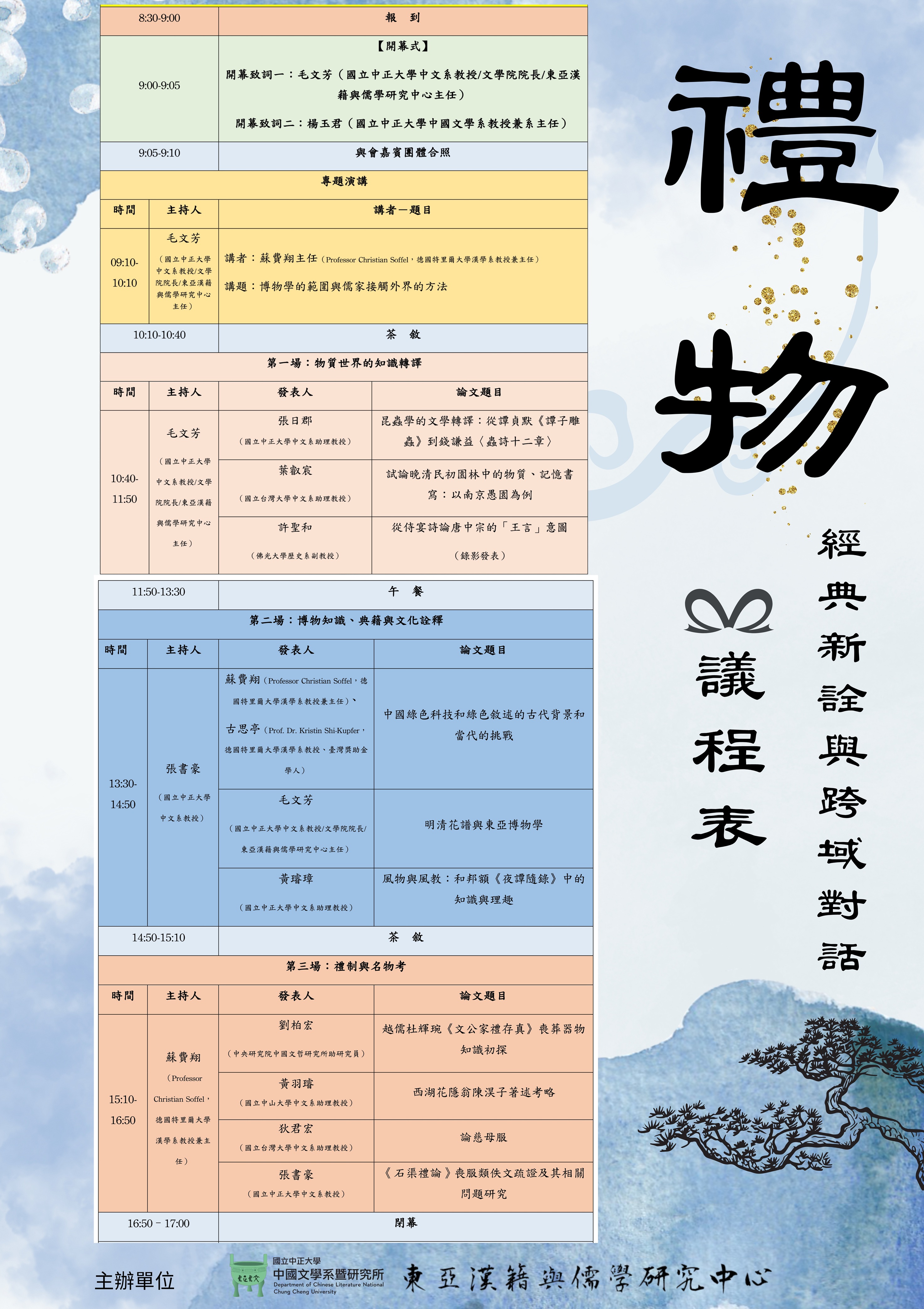 本工作坊以「禮學」與「博物學」為核心,探討其在中國經典文本中的意涵與當代詮釋,並透過跨領域視角,促進國內外學者的交流與對話。誠摯邀請師長、研究生踴躍參與,共同拓展研究視野,深化學術思考,並推動跨學科的合作與創新。